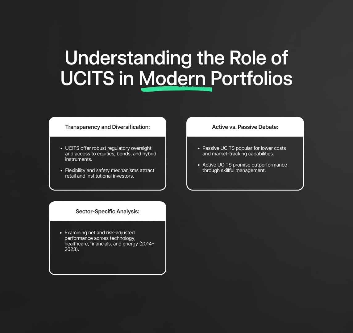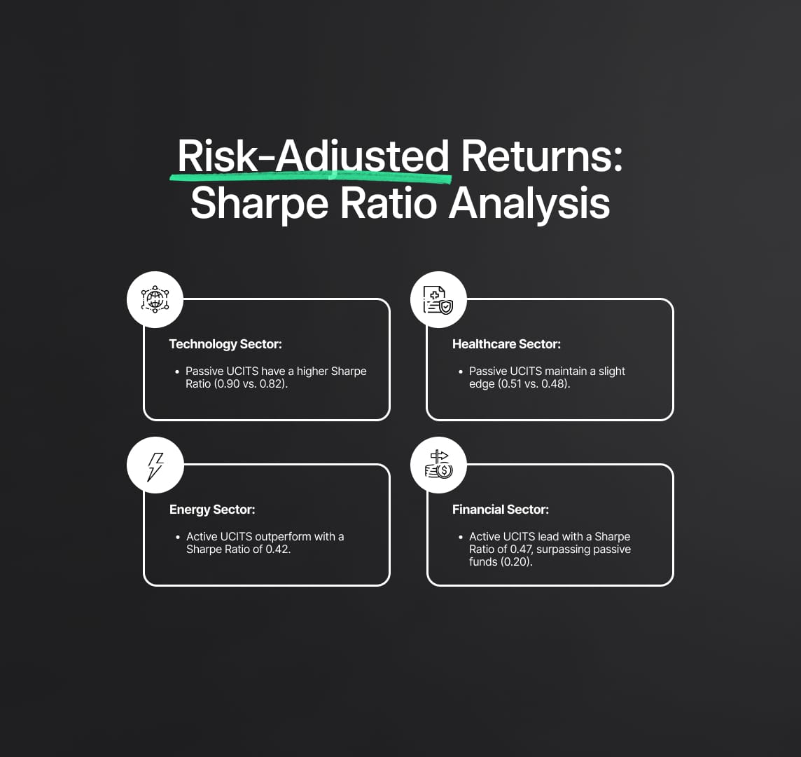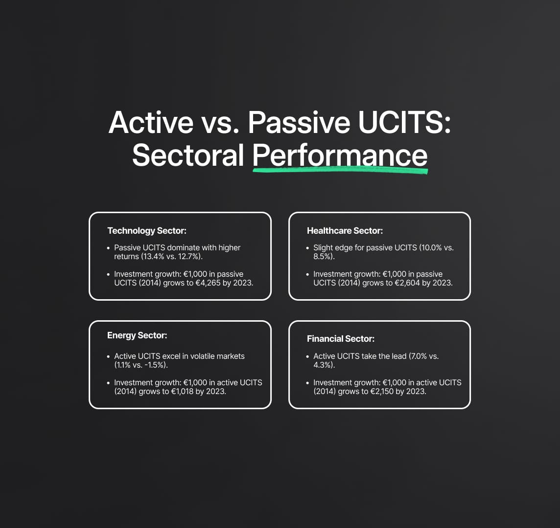The sectoral performance of UCITS highlights the differences between active and passive strategies. Passive UCITS dominate in technology and healthcare due to efficiency and scalability, while active UCITS excel in energy and financials by navigating volatility and complexities.
