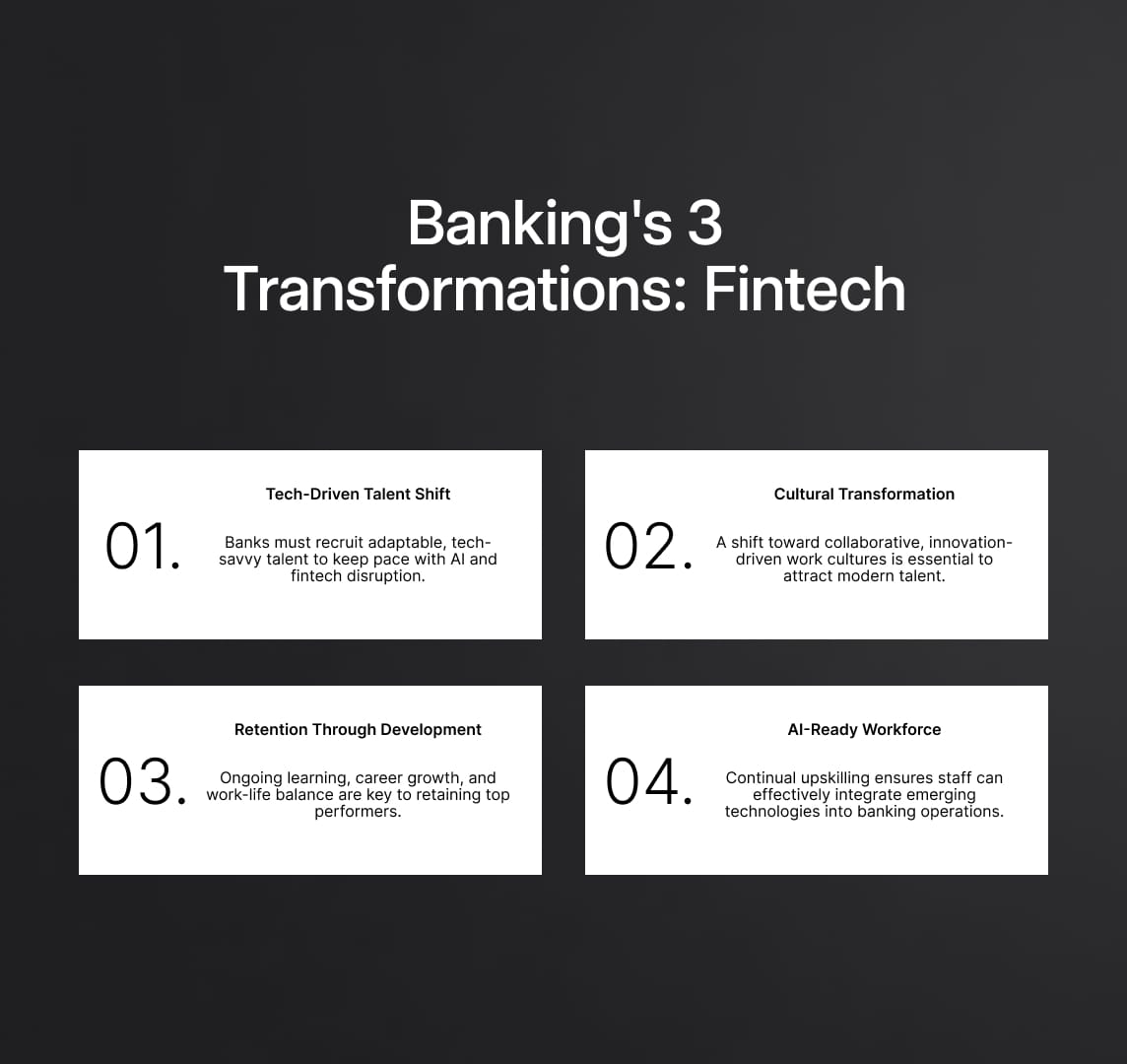 The rapid speed of technical improvements and the growing competition from fintech startups are driving a talent management revolution in the banking industry. This sector, which was once thought to be a stronghold of stability, is presently spearheading a significant change in the way it recruits, retains, and develops talent.