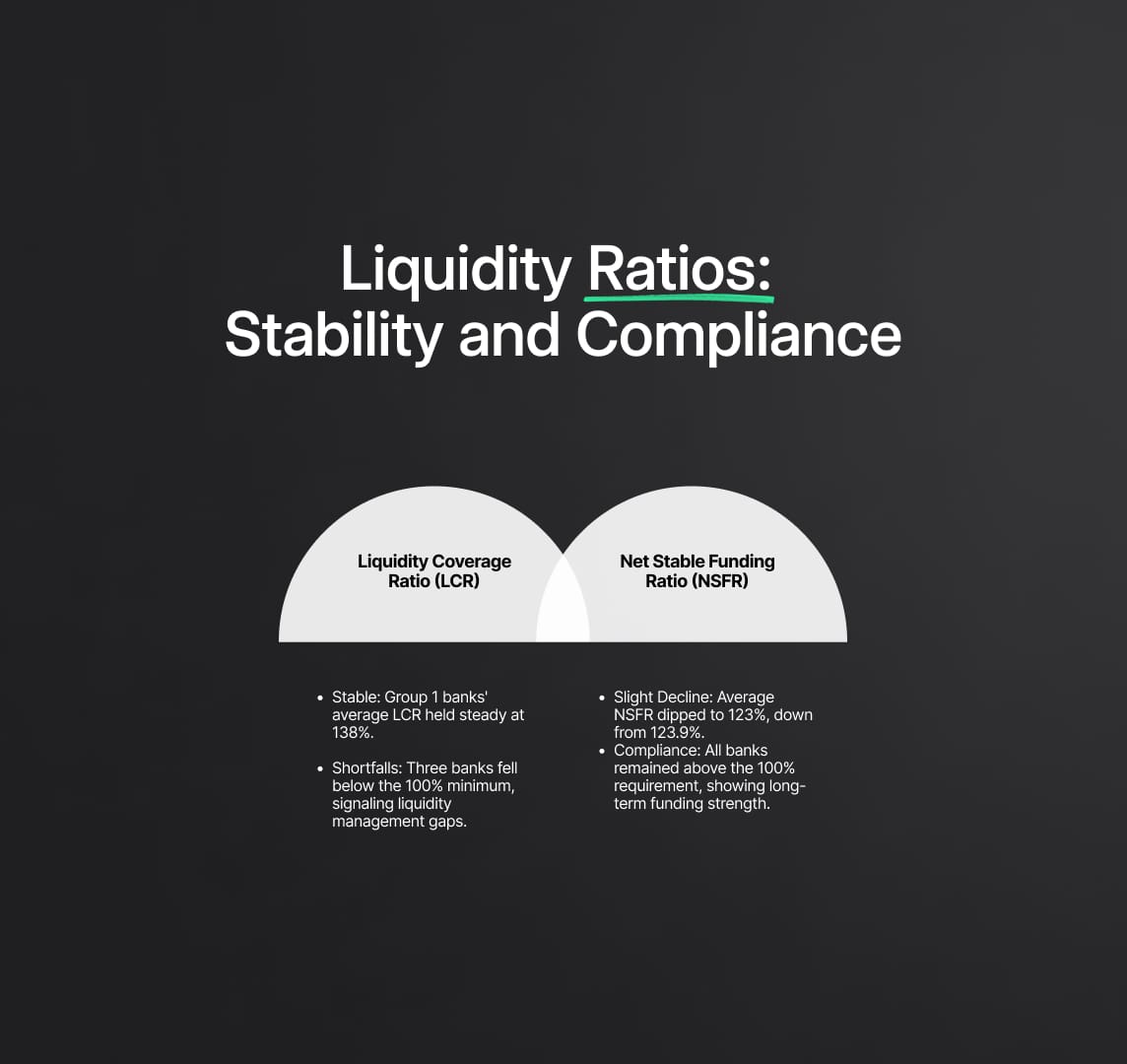 - Stable LCR: The weighted average LCR for Group 1 banks remained stable at 138%, compared to 138.5% in the previous reporting period. The LCR mandates that banks hold a sufficient stock of high-quality liquid assets (HQLA) to cover net cash outflows during a 30-day stress period. This ensures short-term liquidity under adverse market conditions, further safeguarding the banking sector against liquidity crunches.
