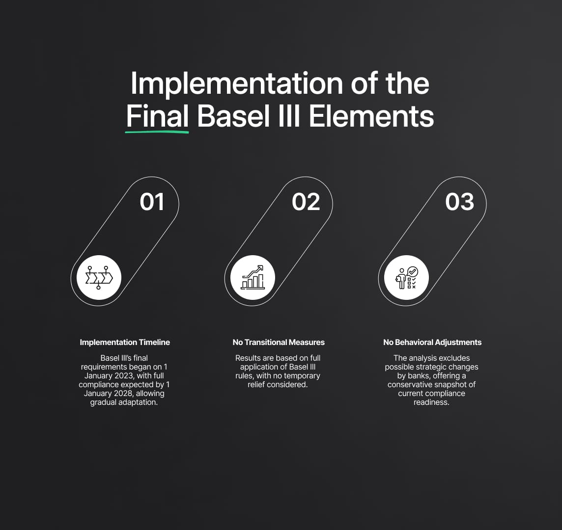The results presented assume full application of the Basel III standards without transitional arrangements, which will expire on 1 January 2028. This means that banks are evaluated as if they have fully implemented the Basel III reforms, without relying on any temporary relief measures that may ease the regulatory burden.