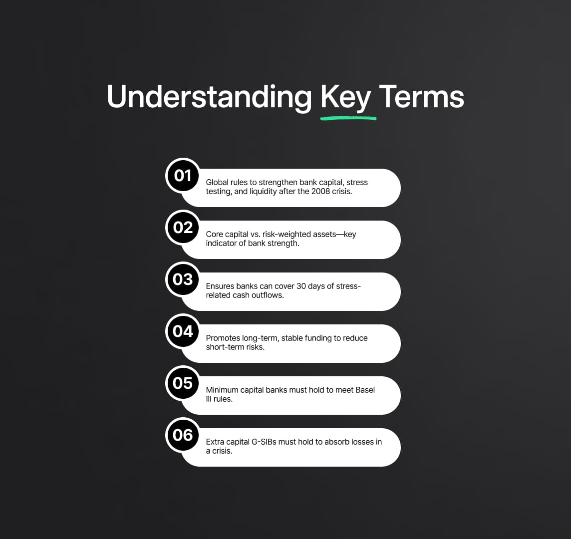 - Basel III Framework: A comprehensive global regulatory standard focused on strengthening bank capital adequacy, enhancing stress testing procedures, and improving market liquidity risk management. It was introduced to address deficiencies in financial regulation revealed by the 2007–2008 financial crisis.