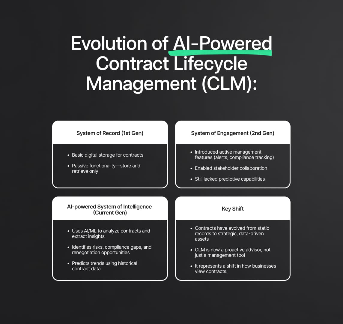 - Phase 3: System of Intelligence. The current era of Contract Lifecycle Management is defined by Artificial Intelligence. AI transforms a CLM platform from a management tool into an intelligent advisor. By using machine learning and natural language processing, this system of intelligence can analyze contracts to identify risks, flag non-standard clauses, and provide deep analytical insights into performance. Contracts are no longer seen as static legal text but as dynamic data assets that inform business strategy.