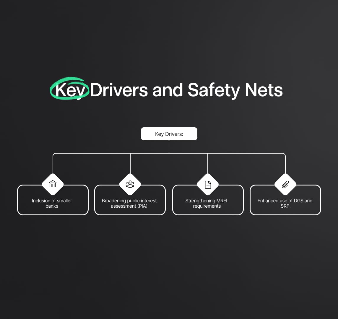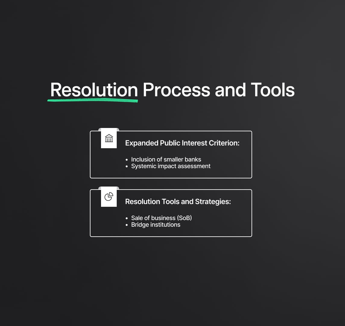 - Public Interest Assessment (PIA): Broadening the public interest assessment criteria to ensure that the resolution authorities can effectively intervene in the insolvency of smaller banks when they pose a threat to financial stability.