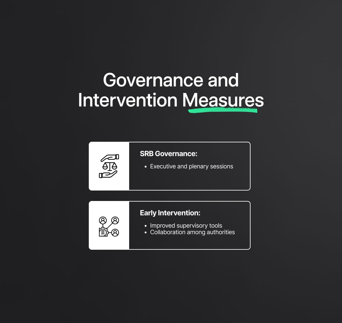 - Triggers for Action: The framework specifies clear metrics and thresholds, such as breaches in capital requirements or liquidity shortfalls, that trigger early intervention measures. These metrics are continuously monitored to ensure timely action.
