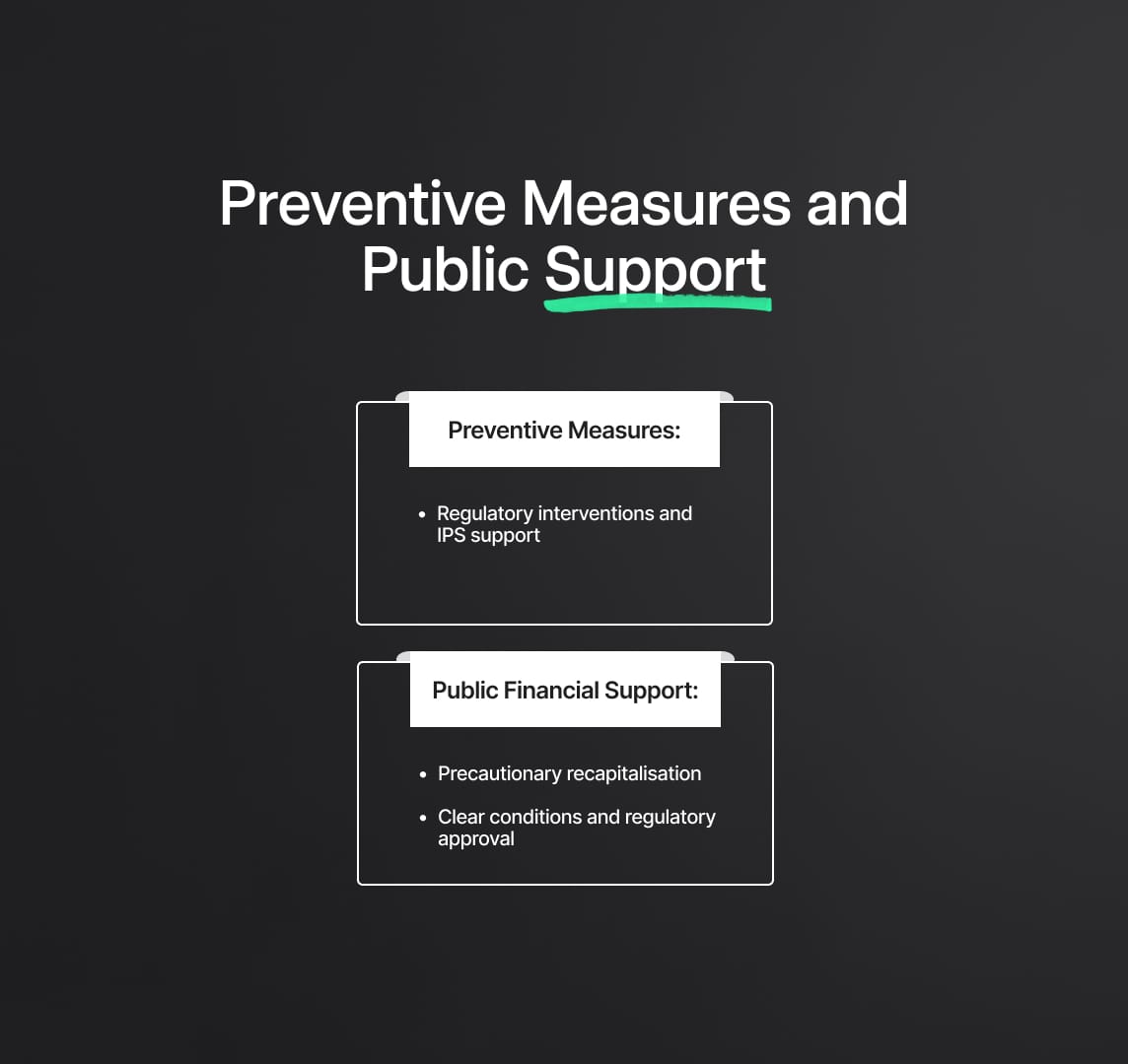 - Preventive Measures: Authorities can implement measures such as temporary public ownership, precautionary recapitalisation, and liquidity support to stabilize banks before resolution becomes necessary.