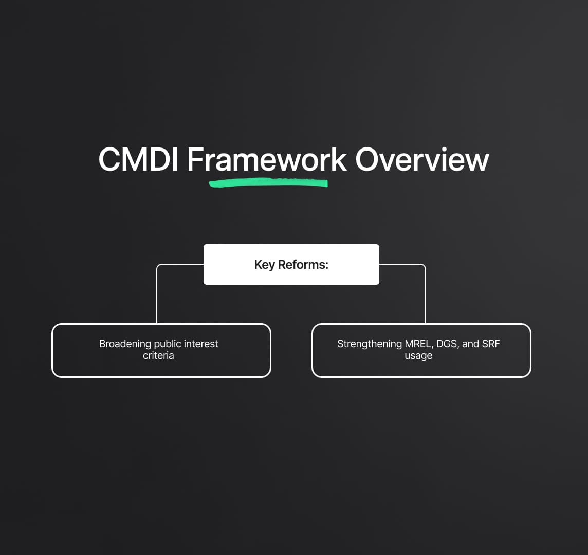 - Operational Integration: The CMDI framework integrates the SRF into the resolution planning and execution phases, ensuring that funds are available to bridge financial gaps and facilitate orderly resolution.