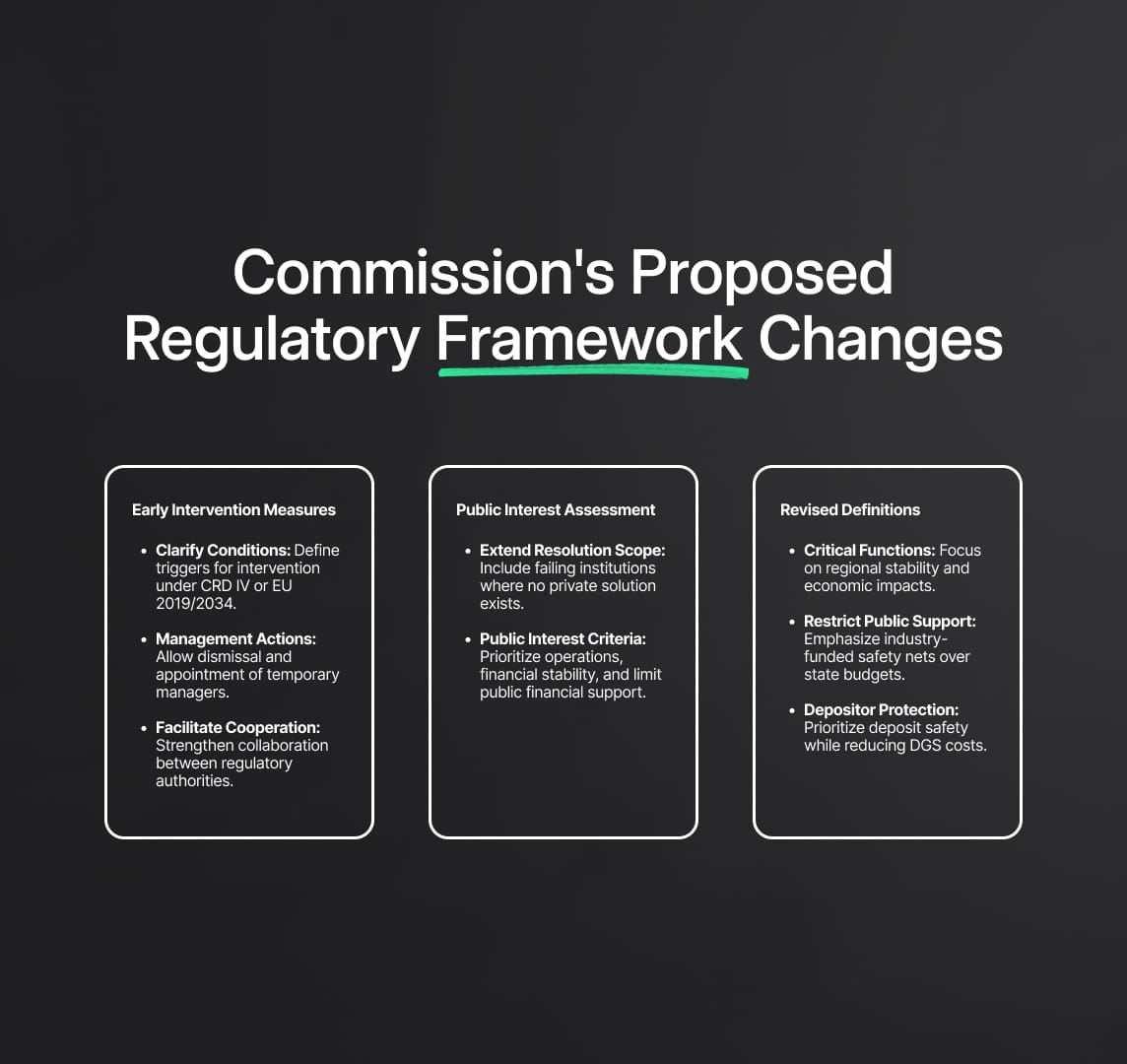 - Clarification of Conditions: To eliminate confusion, the Commission recommends changing the requirements for implementing early intervention measures. This entails defining the conditions that allow early intervention measures to be put into place. For example, when the Investment Firms Directive (EU) 2019/2034 or the Capital Requirements Directive IV (CRD IV) require supervisory measures, but the institution has not implemented them or deems them insufficient to address issues that have been identified.