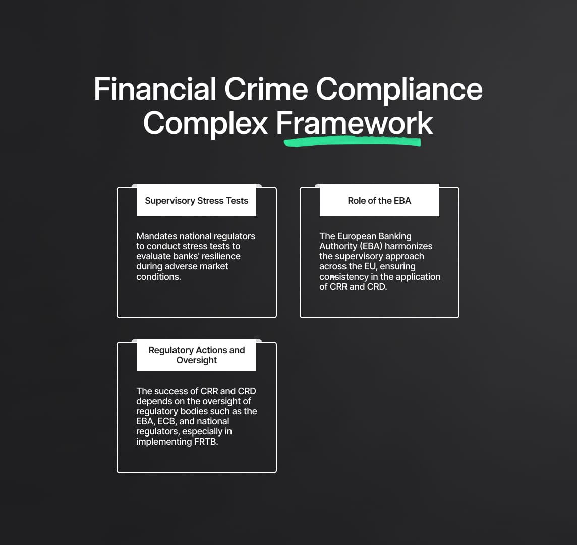 The CRD mandates that national regulators conduct supervisory stress tests to evaluate banks’ ability to maintain adequate capital during adverse market conditions. The European Banking Authority (EBA) plays a key role in harmonizing the supervisory approach across the EU, ensuring consistency in how CRR and CRD are applied. This alignment contributes to a more unified, stable financial system, enhancing the EU's ability to manage cross-border risks.