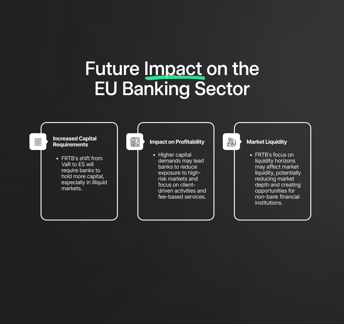 The increased capital demands under FRTB will impact the profitability of banks, particularly in trading activities. As capital costs rise, banks may reduce exposure to high-risk markets or eliminate less profitable business lines. Many institutions may shift their focus toward client-driven activities and fee-based services, which require less capital and offer a more stable revenue stream under the updated CRR framework.