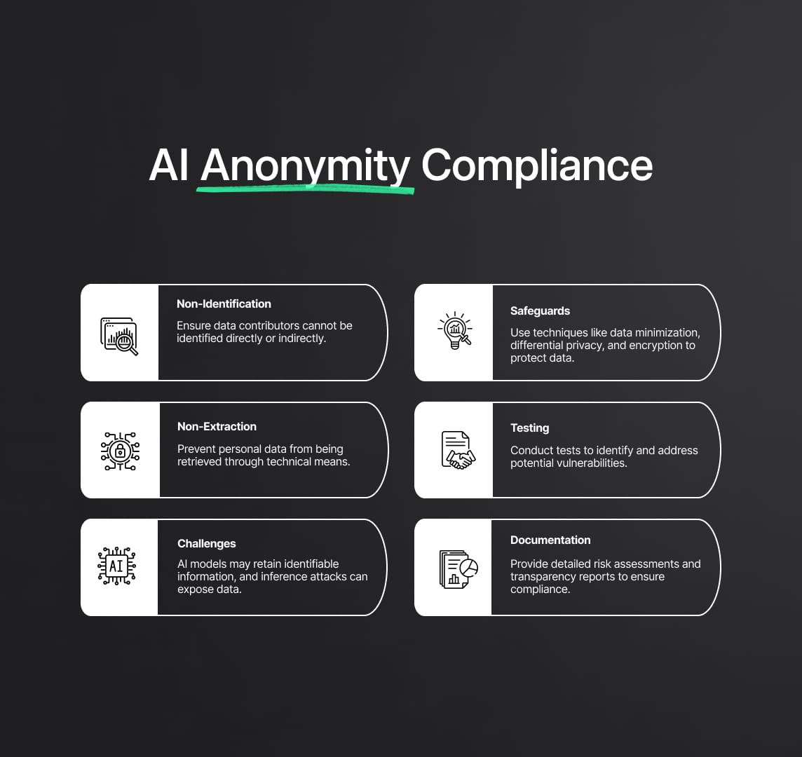 Under GDPR, anonymized data falls outside its scope. However, achieving true anonymity in AI models requires meeting stringent criteria: