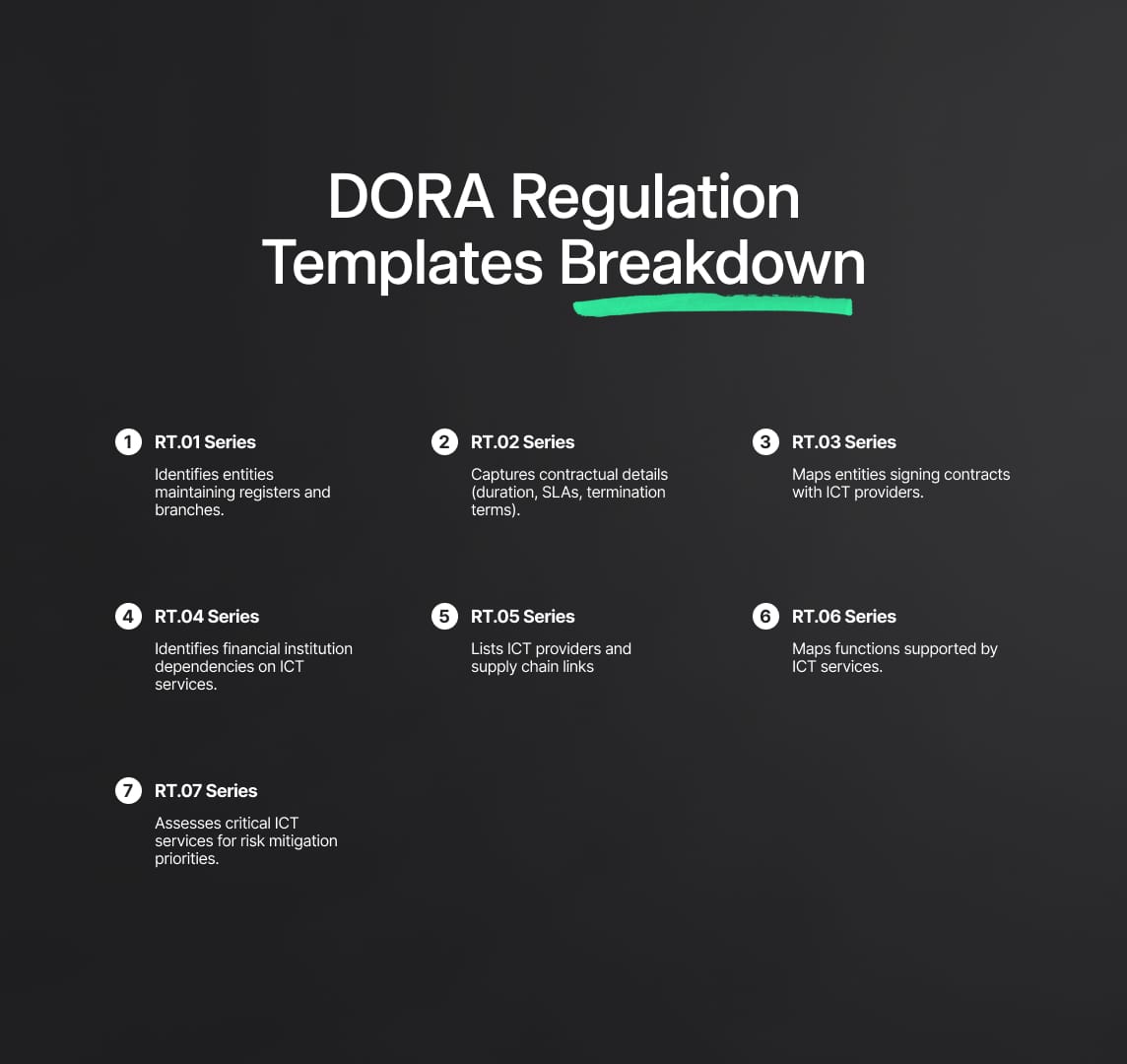 RT.03 Series: This series identifies the entities and ICT third-party providers involved in signing contractual arrangements. It ensures that there is a clear record of all parties responsible for delivering and managing ICT services.