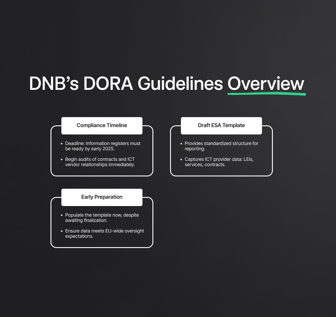 Meeting this deadline requires a thorough audit of existing ICT third-party relationships, including the review of all contracts, service agreements, and risk assessments related to ICT services provided by external vendors. The DNB’s insistence on this timeline underscores the rigorous regulatory expectations under DORA and the significant consequences of delays in preparation.