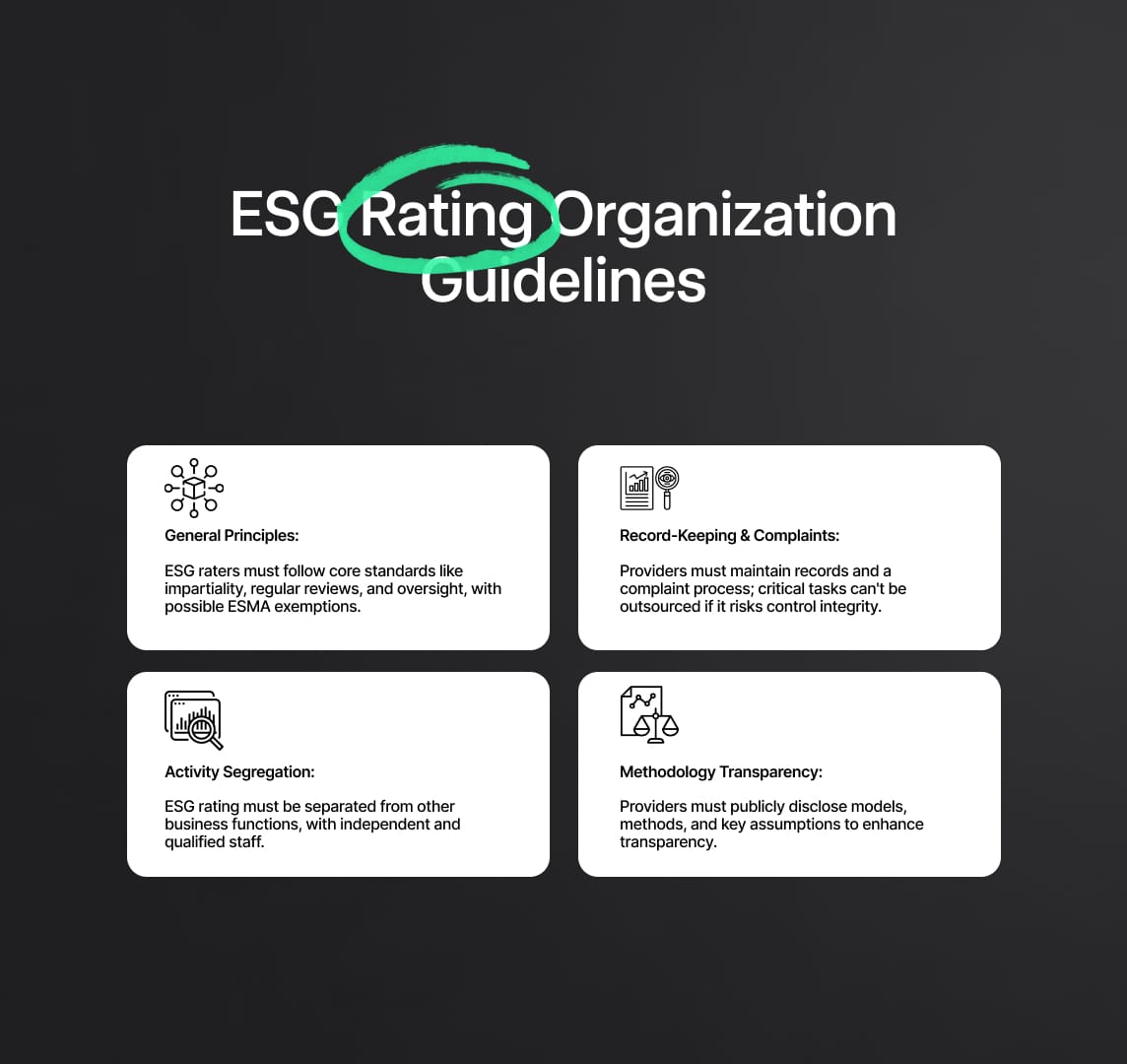 - Activity Segregation: Providers are required to uphold a clear division between their ESG rating operations and their other commercial activities, such as benchmark development, credit rating issuance, and consultation. Workers must be independent, have the necessary experience, and know what it takes.