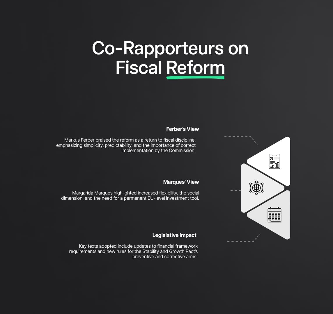 The personal perspective on the most recent fiscal reforms directly from Margarida Marques and Markus Ferber, the co-rapporteurs. Their insights clarified the relevance and possible consequences of the new rules, highlighting the necessity of their efficient execution as well as the chances they offer for investment and societal advancement inside the European Union.