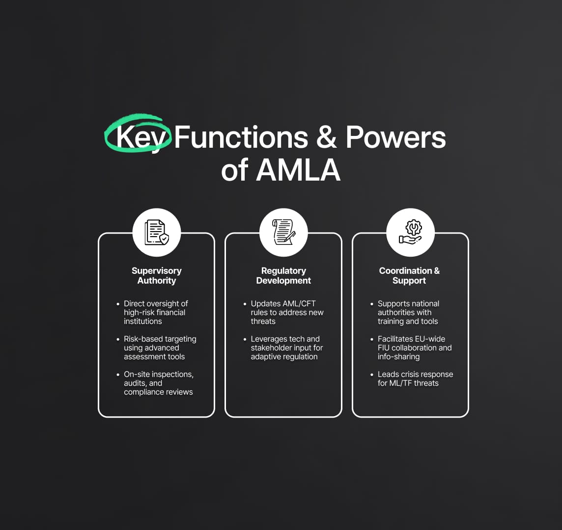 AMLA's establishment brings several critical functions and powers that will reshape the AML/CFT landscape in Europe. These include direct supervision of high-risk financial institutions, regulatory development, and coordination with national authorities and Financial Intelligence Units (FIUs).