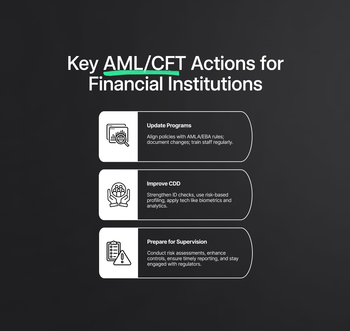 To navigate these changes effectively, financial institutions need to take proactive steps to strengthen their AML/CFT frameworks. Here are the key actions institutions should focus on:
