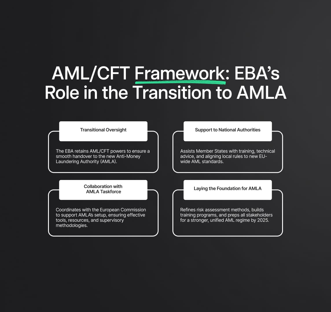 The EBA has been at the forefront of AML/CFT efforts within the EU since 2020. With the new AML framework, the EBA will continue to wield its AML/CFT powers and mandates until December 2025 to ensure a seamless transition. During this period, the EBA will collaborate closely with AMLA and provide crucial support to Member State competent authorities.