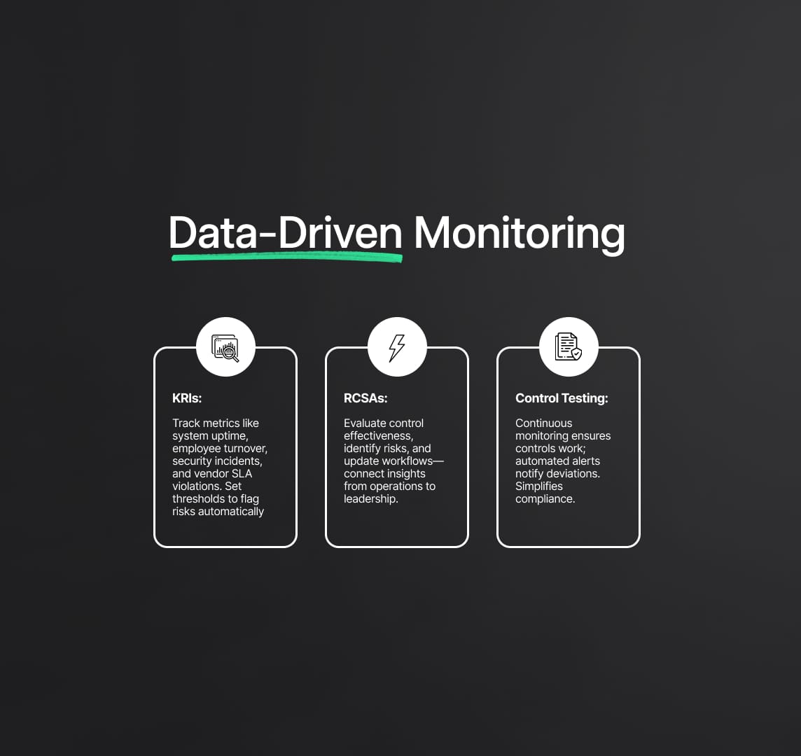 Executives and compliance officers need timely insights for critical operational concerns. By configuring thresholds in Key Risk Indicators (KRIs), the GRC system can issue real-time alerts whenever risk levels exceed predefined tolerances, enabling swift mitigation efforts.