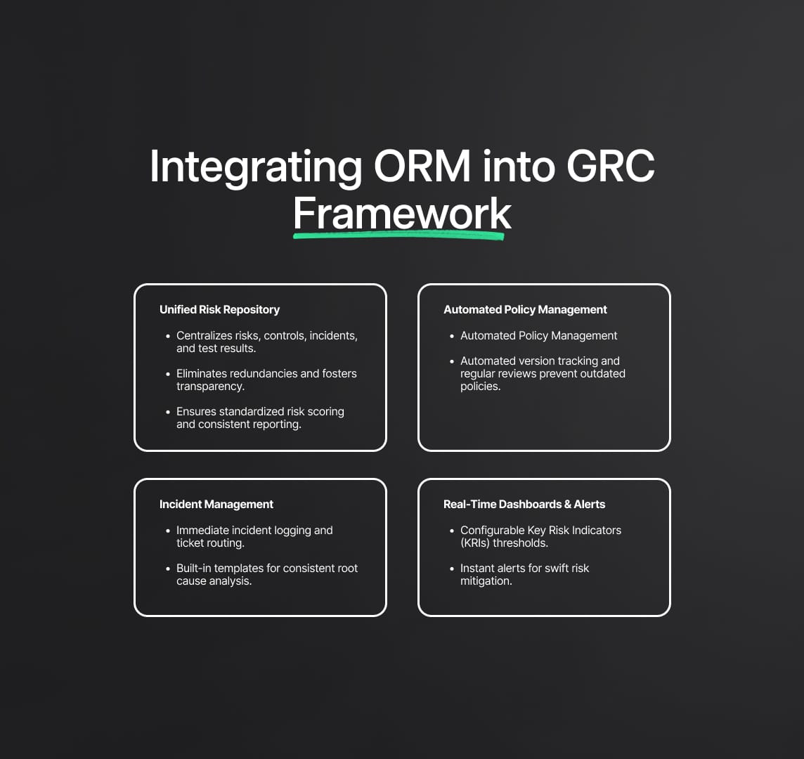 Centralizing operational risks, along with associated controls, incidents, and test results, within a GRC tool fosters transparency and eliminates redundant data silos. It also helps standardize risk scoring scales and ensures consistent reporting.