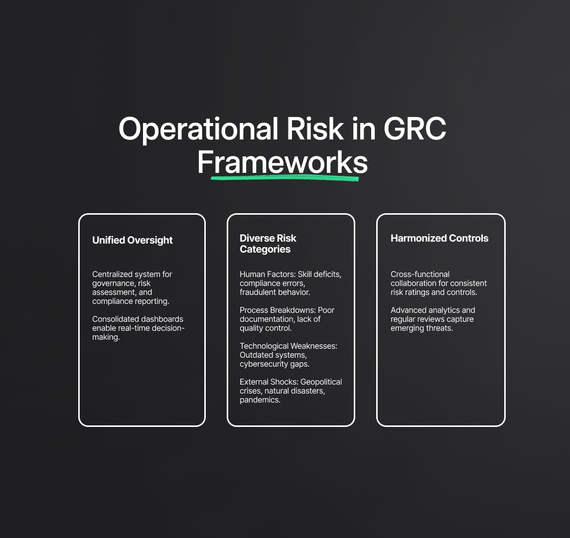 Because operational risk is so broad, a GRC framework must harmonize controls across diverse areas. This requires cross-functional collaboration, advanced analytics, and a constant review cycle to capture emerging threats.