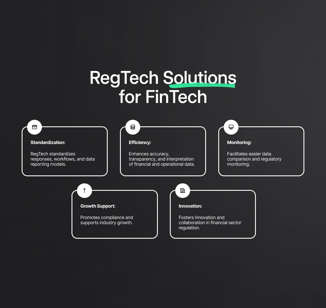 Regtech, short for Regulatory Technology, assists the Fintech industry by standardizing responses, workflows, and data reporting models[1]. This helps Fintech companies ensure their responses to regulatory bodies are consistent, and their operations are efficient.