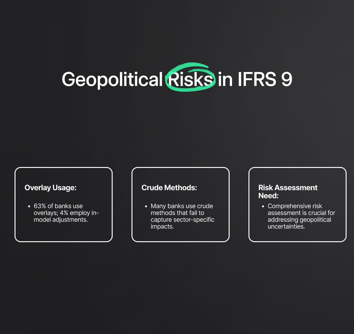 IFRS 9 requires banks to include forward-looking data in expected credit loss calculations, posing challenges with risks like COVID-19, geopolitical instability, high interest rates, inflation, and climate change. Overlays and strong governance are vital for managing these risks effectively.