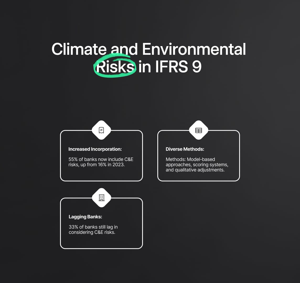 Despite notable progress, significant challenges remain. The ECB's review identified that 33% of banks still do not consider C&E risks in their provisioning frameworks. Additionally, 12% of banks rely on macro-components of their IFRS 9 models to address these risks indirectly through general forward-looking scenarios. This indirect approach often lacks the necessary risk sensitivity and fails to differentiate between debtors unevenly affected by C&E risks. As a result, the risk assessments can be incomplete, potentially leading to inadequate provisioning for these long-term risks.