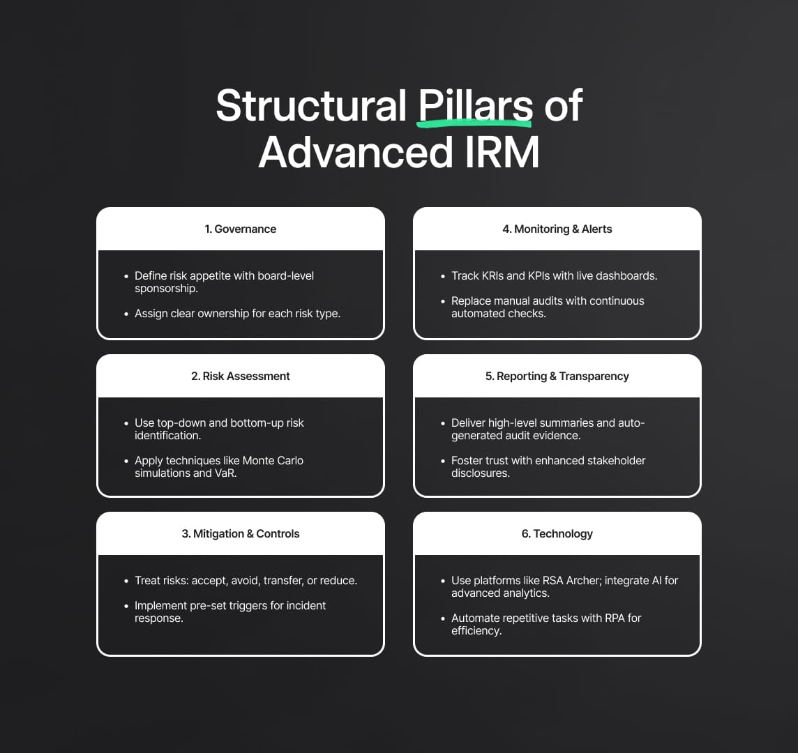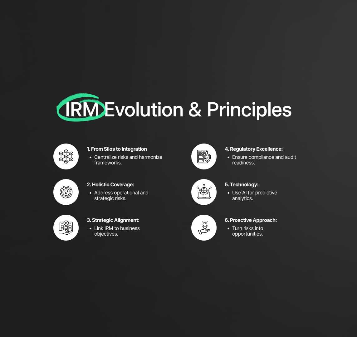 - IRM (Integrated Risk Management): Encompasses GRC and ERM attributes while adding deeper data integration, real-time analytics, cohesive technology platforms, and forward-looking scenario modeling. IRM also emphasizes synergy between operational and strategic risks, bridging the gap between day-to-day risk controls and long-term objectives.