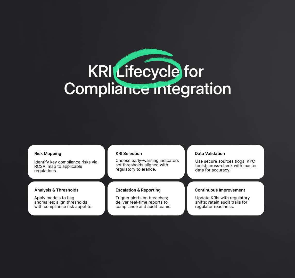A well-orchestrated KRI lifecycle ensures that compliance considerations are embedded at every step—strengthening both operational resilience and legal adherence.