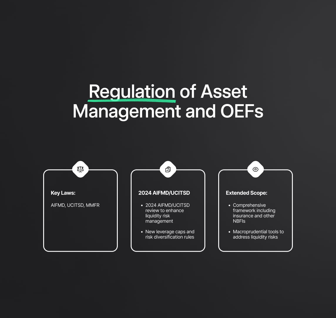 Key laws like the AIFMD, UCITSD, and MMFR regulate the EU's regulatory framework for the investment fund industry, specifically for asset management and open-ended funds (OEFs). These rules cover a range of specifications related to portfolio concentration, transparency, leverage, and liquidity risk management.