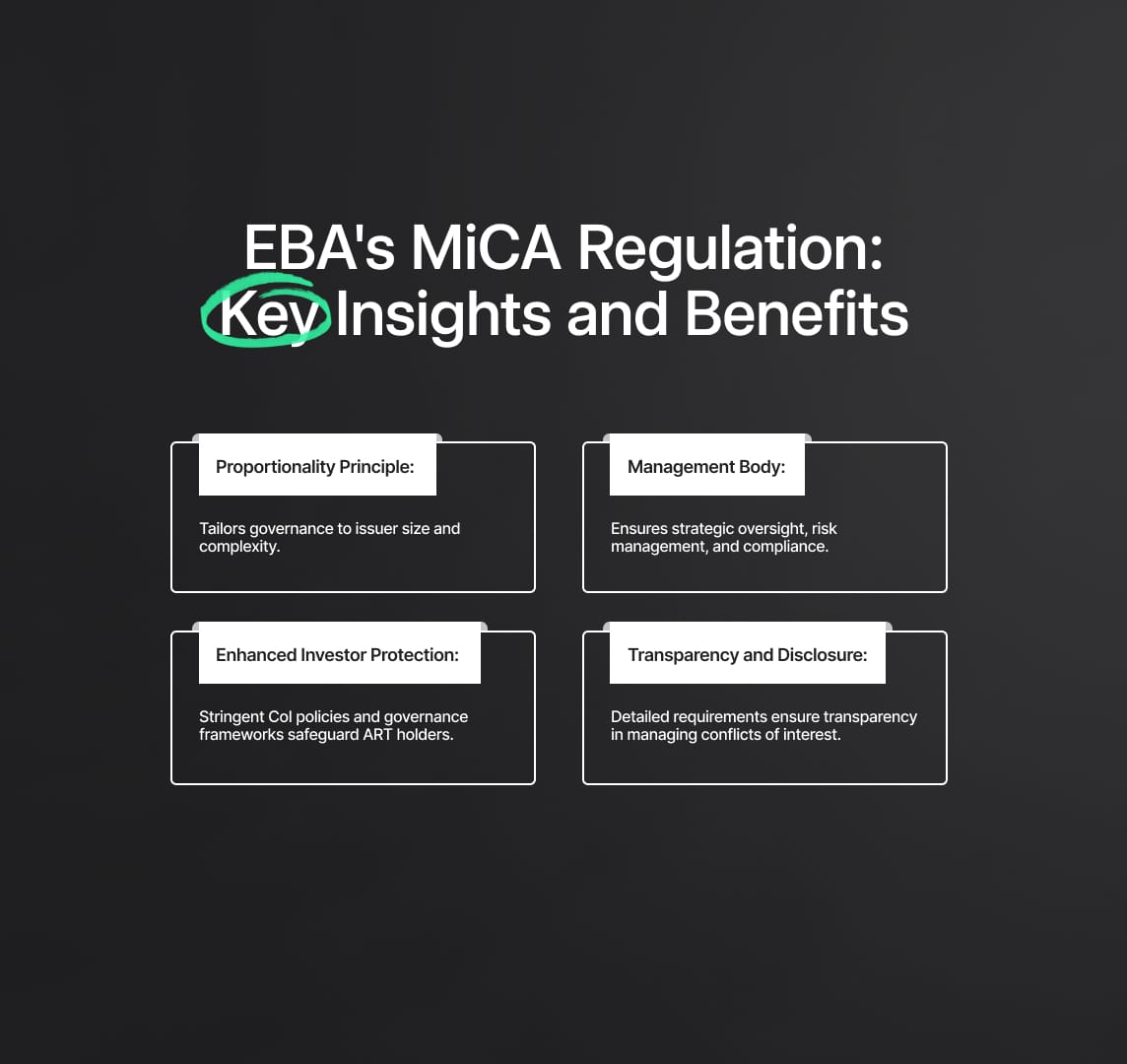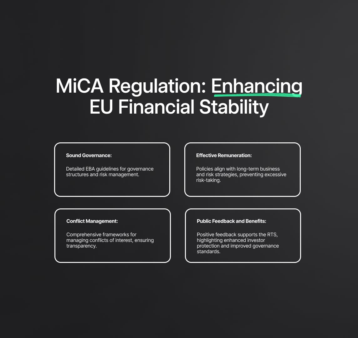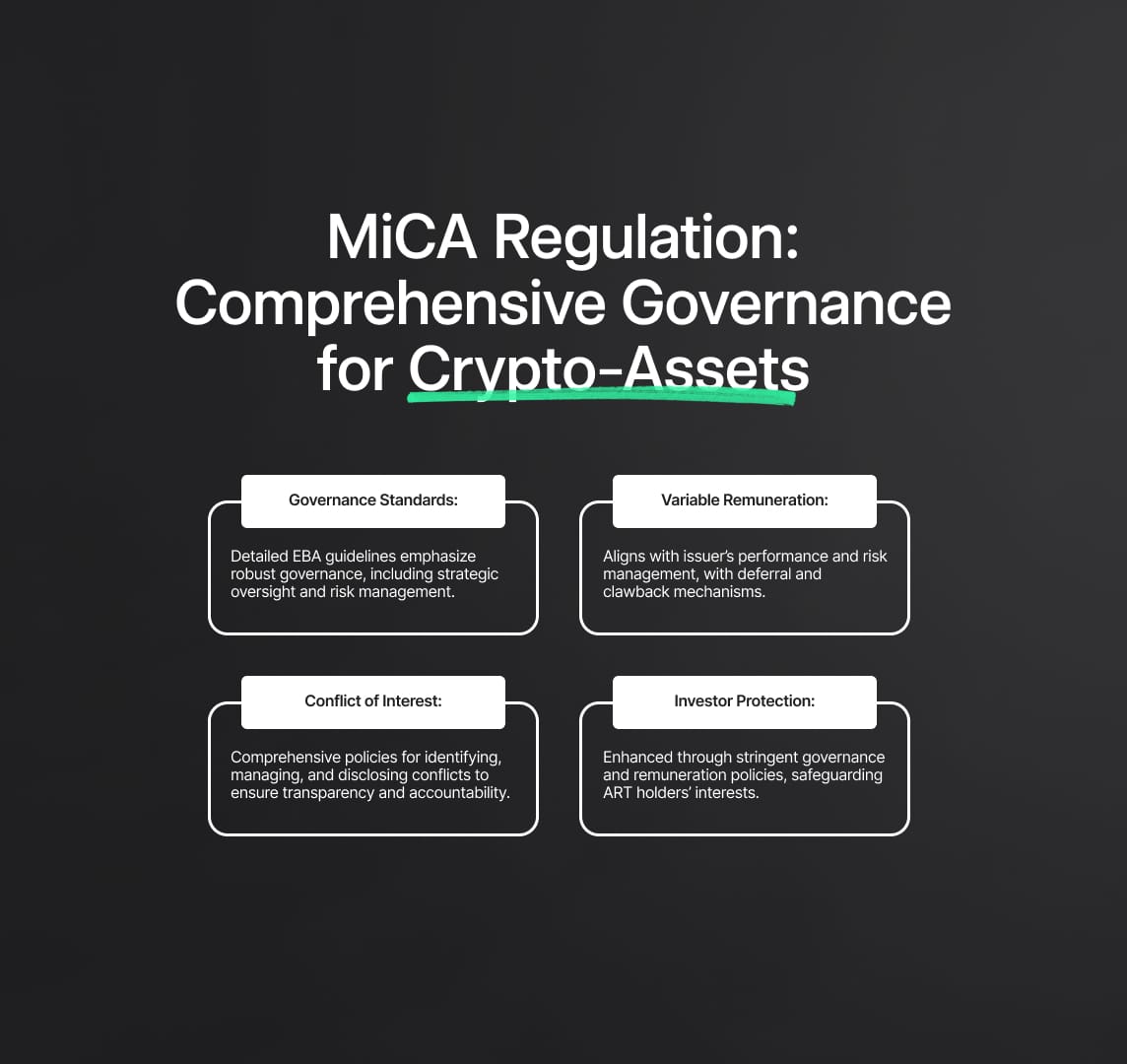 The MiCA Regulation establishes a comprehensive framework for crypto-assets in the EU, enhancing market integrity and consumer protection. The EBA provide guidelines and RTS for governance, remuneration, and conflict management for asset-referenced tokens (ARTs).