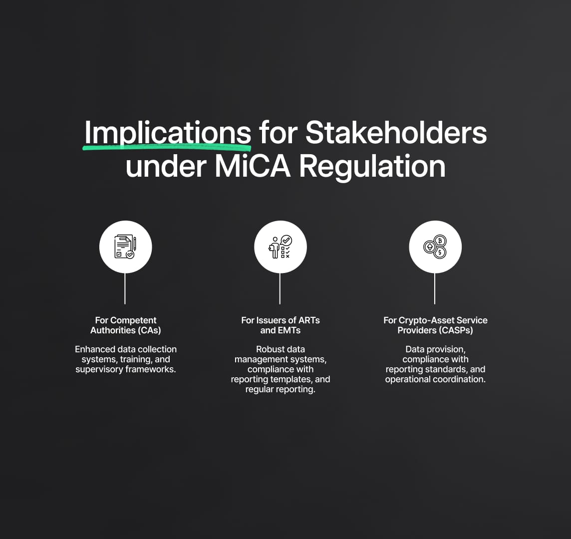 The MiCA Regulation (Regulation (EU) 2023/1114) brings significant changes and responsibilities for various stakeholders in the crypto-asset ecosystem. The implementation of the EBA’s comprehensive guidelines on data reporting will impact Competent Authorities (CAs), issuers of Asset-Referenced Tokens (ARTs) and E-Money Tokens (EMTs), the European Banking Authority (EBA), and Crypto-Asset Service Providers (CASPs). Understanding these implications is crucial for ensuring compliance and fostering a stable and transparent crypto-asset market.