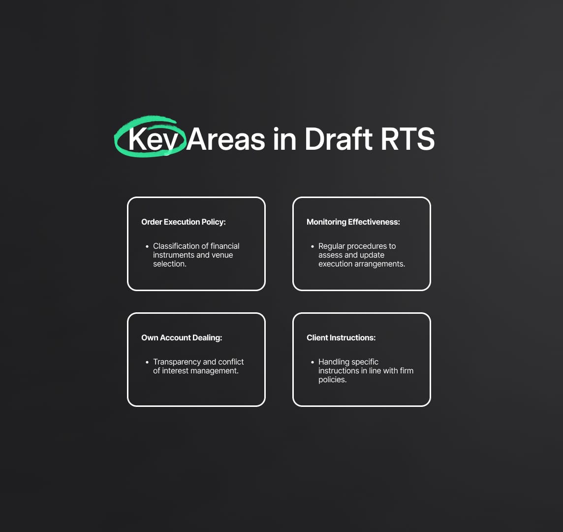 The draft RTS outlines specific criteria and methodologies for selecting execution venues, ensuring continuous monitoring and review of execution policies, and handling client instructions. These detailed proposals are designed to enhance the transparency, effectiveness, and compliance of investment firms' order execution policies under MiFID II Regulation.