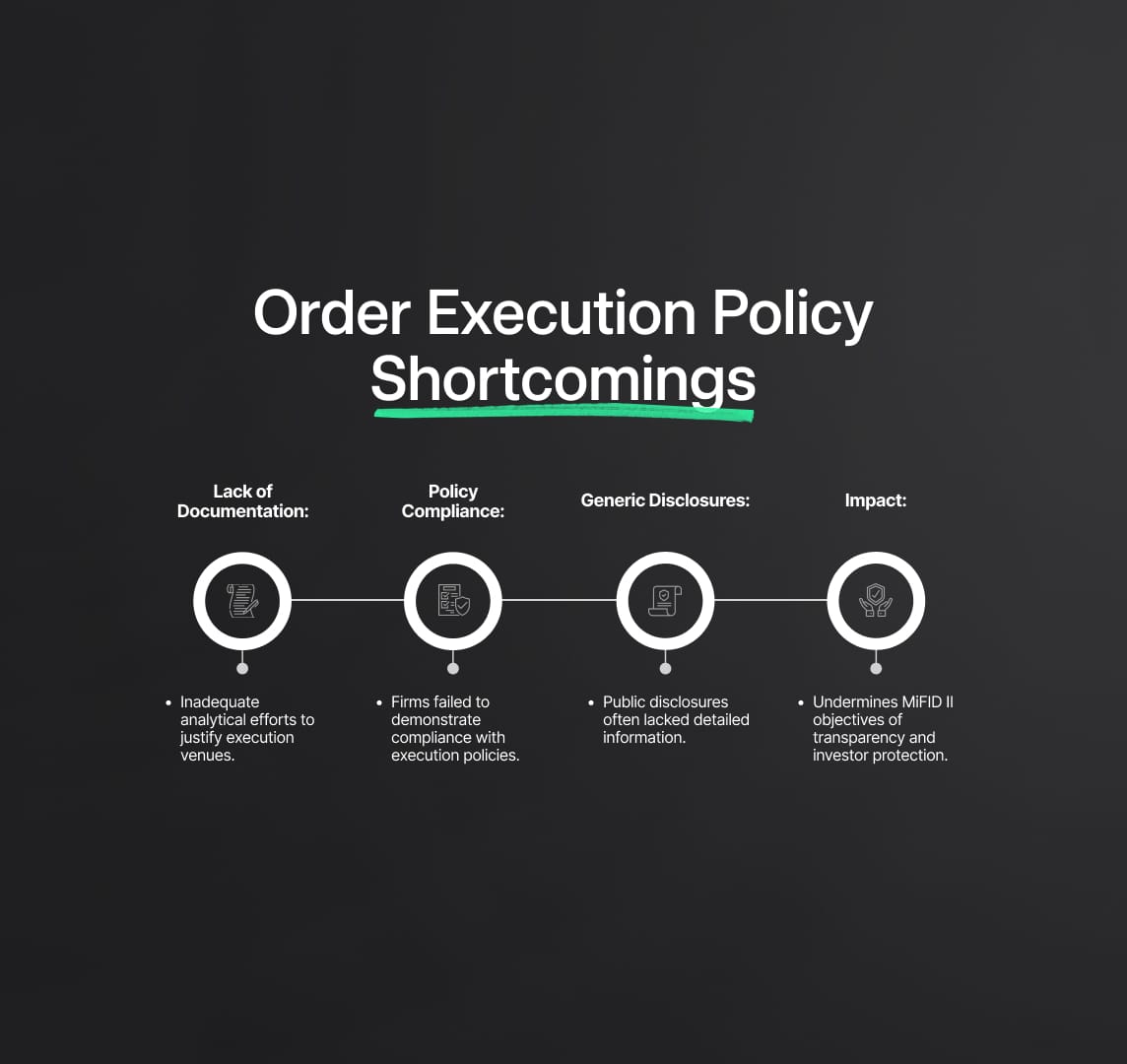 Through extensive supervisory activities and the enforcement of MiFID II best execution requirements, ESMA and competent authorities across EU Member States identified several deficiencies in how firms implemented their execution policies. Notably, it was found that in various jurisdictions: