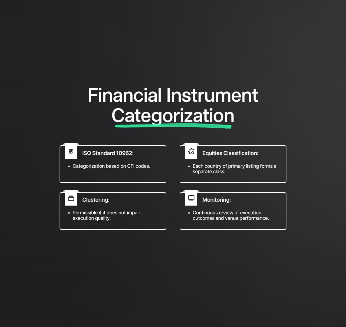 The draft Regulatory Technical Standards (RTS) under MiFID II Regulation emphasize a meticulously structured methodology for categorising financial instruments. This categorisation is pivotal for the effective establishment of order execution policies, ensuring that firms can achieve the best execution outcomes for their clients.