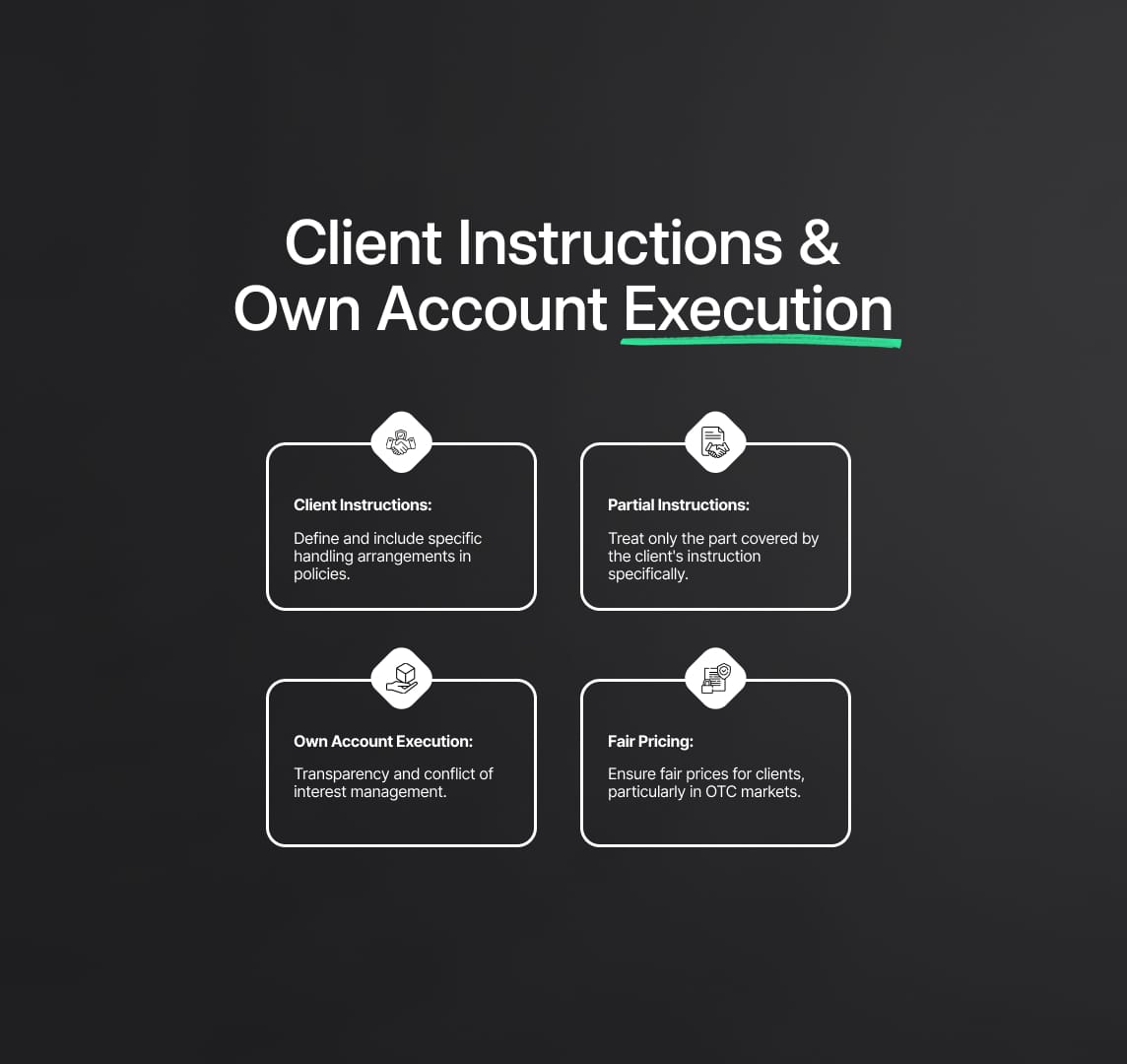 - Policy Requirements: Firms must explicitly state in their execution policies if they execute client orders on their own account. This practice must be justified to ensure it provides the best possible result for clients.