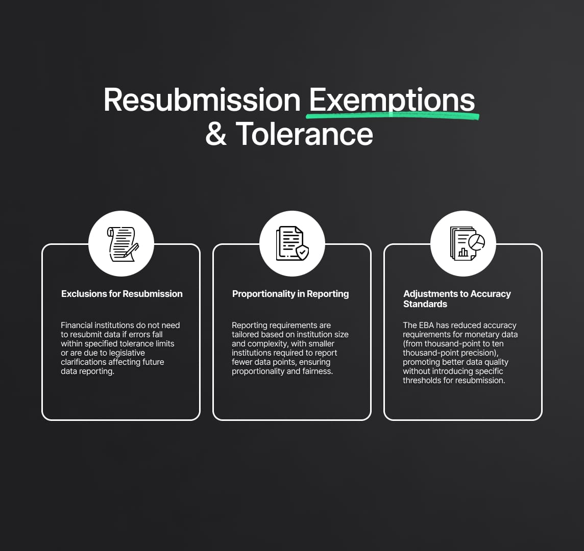 Under the EBA reporting paradigm, financial institutions might not always be required to resubmit past data. It is essential to comprehend these tolerance limits and exclusions in order to ensure regulatory reporting procedures are efficient and compliant.