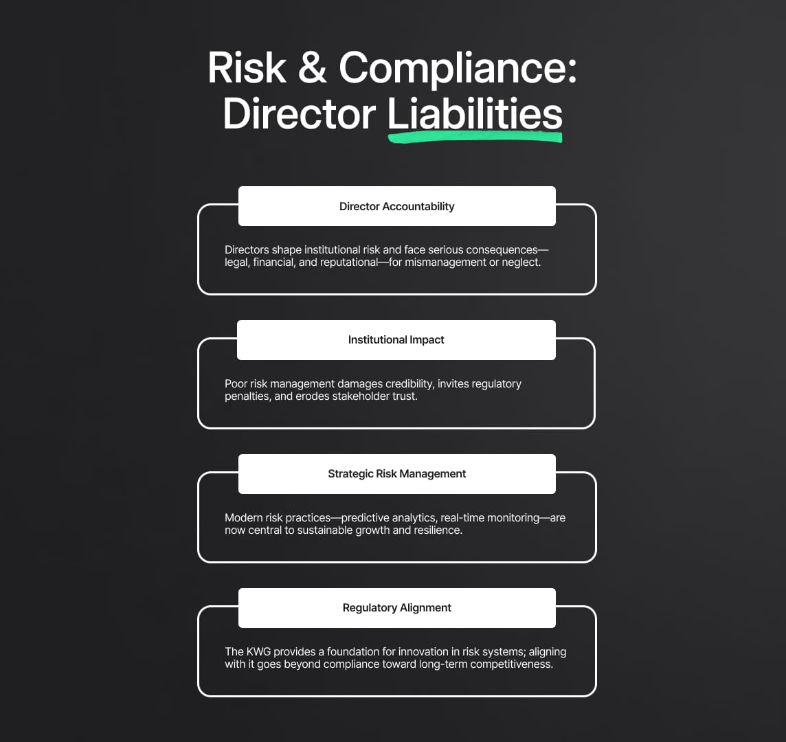 Understanding the subtleties of risk management requires more than just technical expertise for directors. It's about creating an environment where taking calculated risks is valued rather than avoided. A director's error, whether from carelessness or purposeful omission, can have far-reaching effects. The stakes are quite high, ranging from serious financial losses to reputational harm. Directors must be astutely aware of the changing risk picture in order to fulfill their dual role of assuring growth while minimizing risks and making decisions that are in line with both corporate goals and regulatory requirements.
