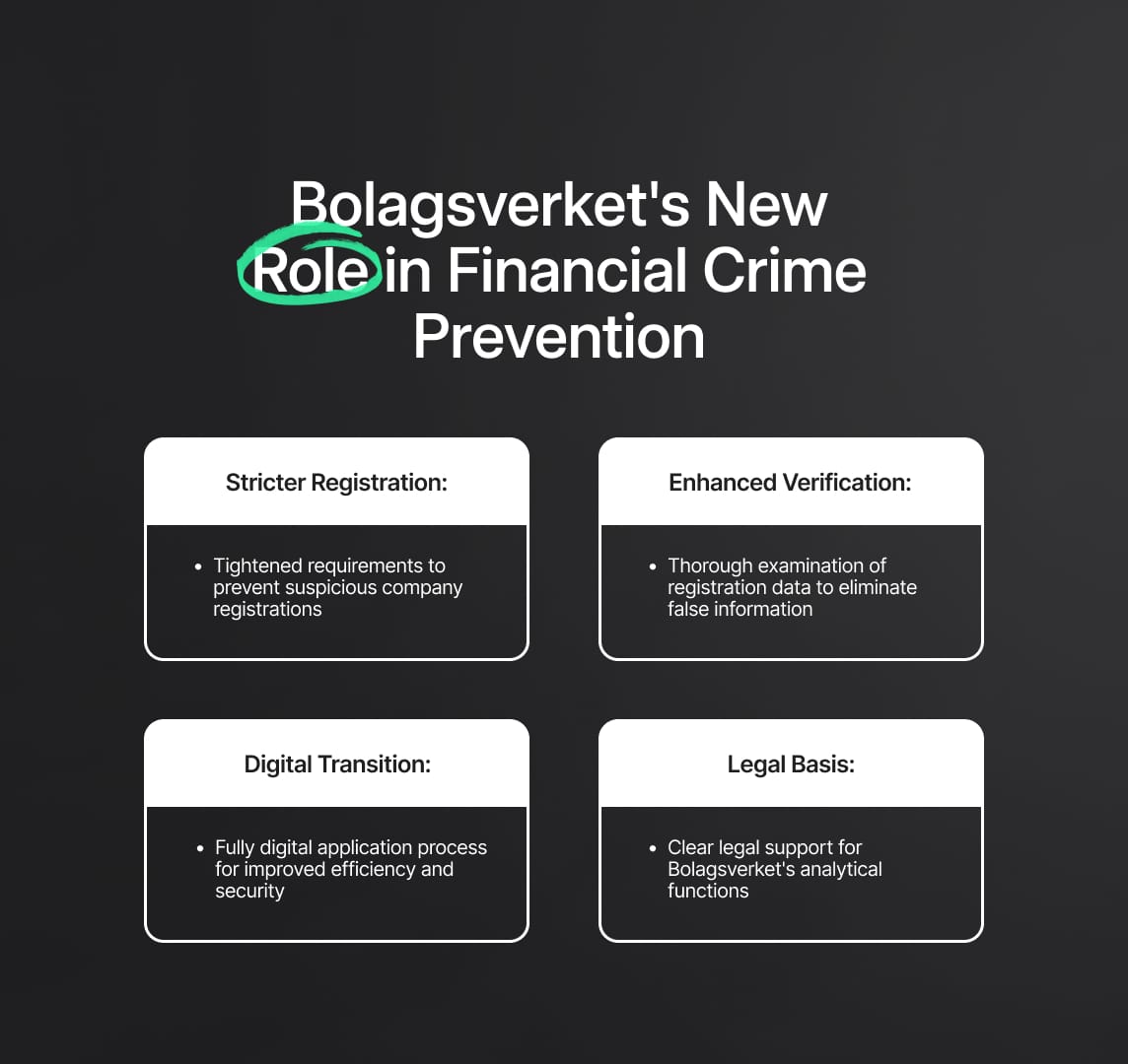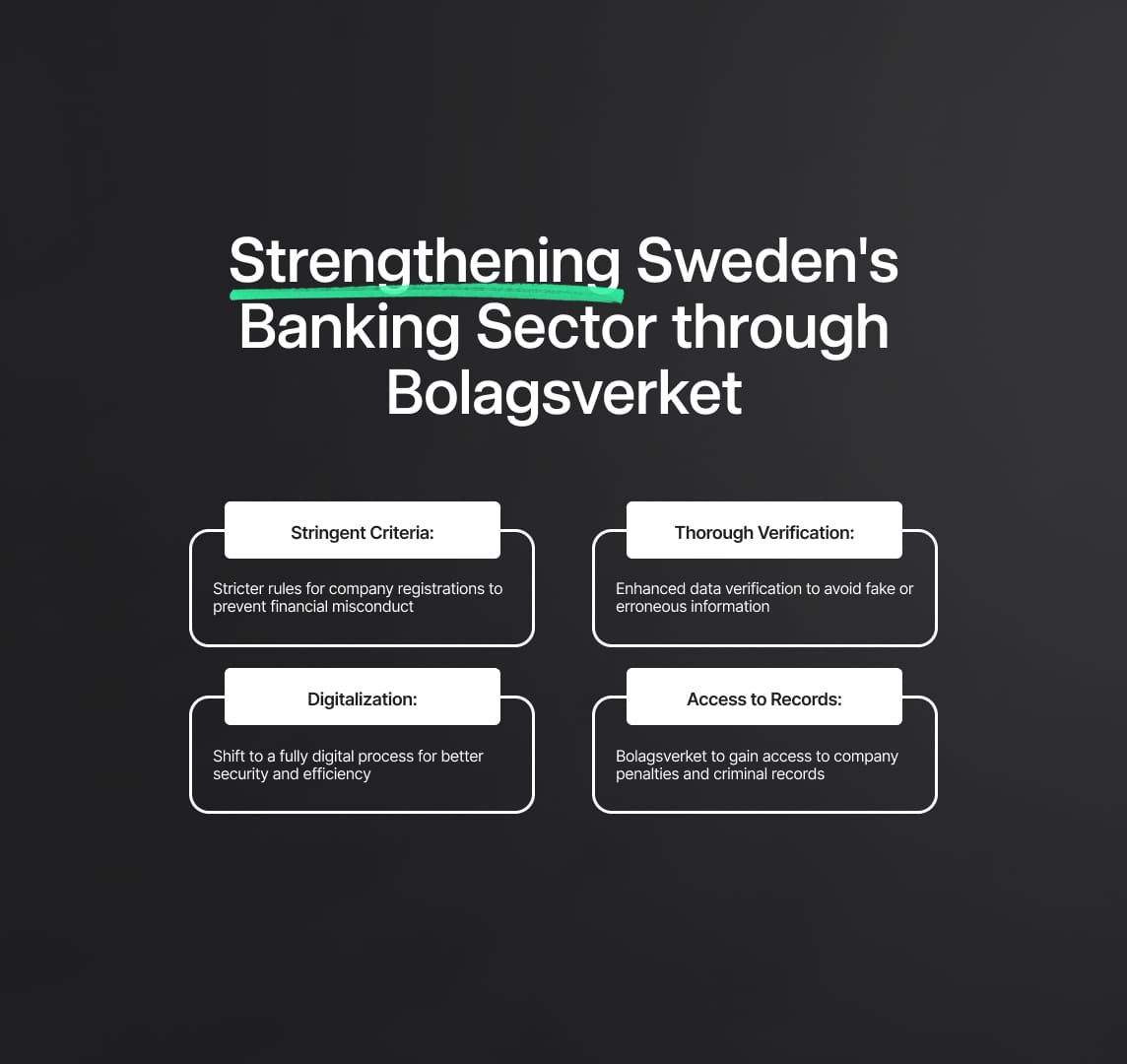Bolagsverket's new role in Financial Crime Compliance, proposed by the Swedish Bank Association, aims to fortify Sweden's banking sector. Key focuses: stringent registration criteria, enhanced verification, and a digital transition.