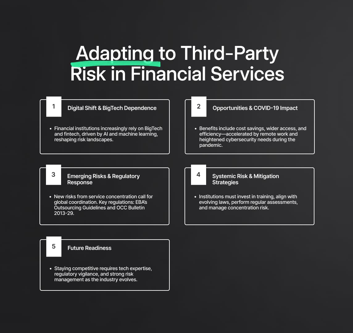Financial institutions rely on BigTech and fintech for services, changing third-party risk management. Tech advancements bring opportunities and challenges, improving efficiency and access to finance. COVID-19 highlights digital platforms and cybersecurity. Regulators adapt to manage new risks.