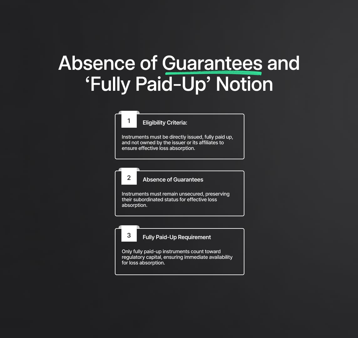 Absence of Guarantees: According to Articles 52(1)(e), 63(e), and 72b(2)(e) of the CRR, eligible instruments must not be secured or enhanced by any form of guarantee that increases the seniority of the claims. This provision ensures that the instruments maintain their subordinated status, crucial for effective loss absorption.