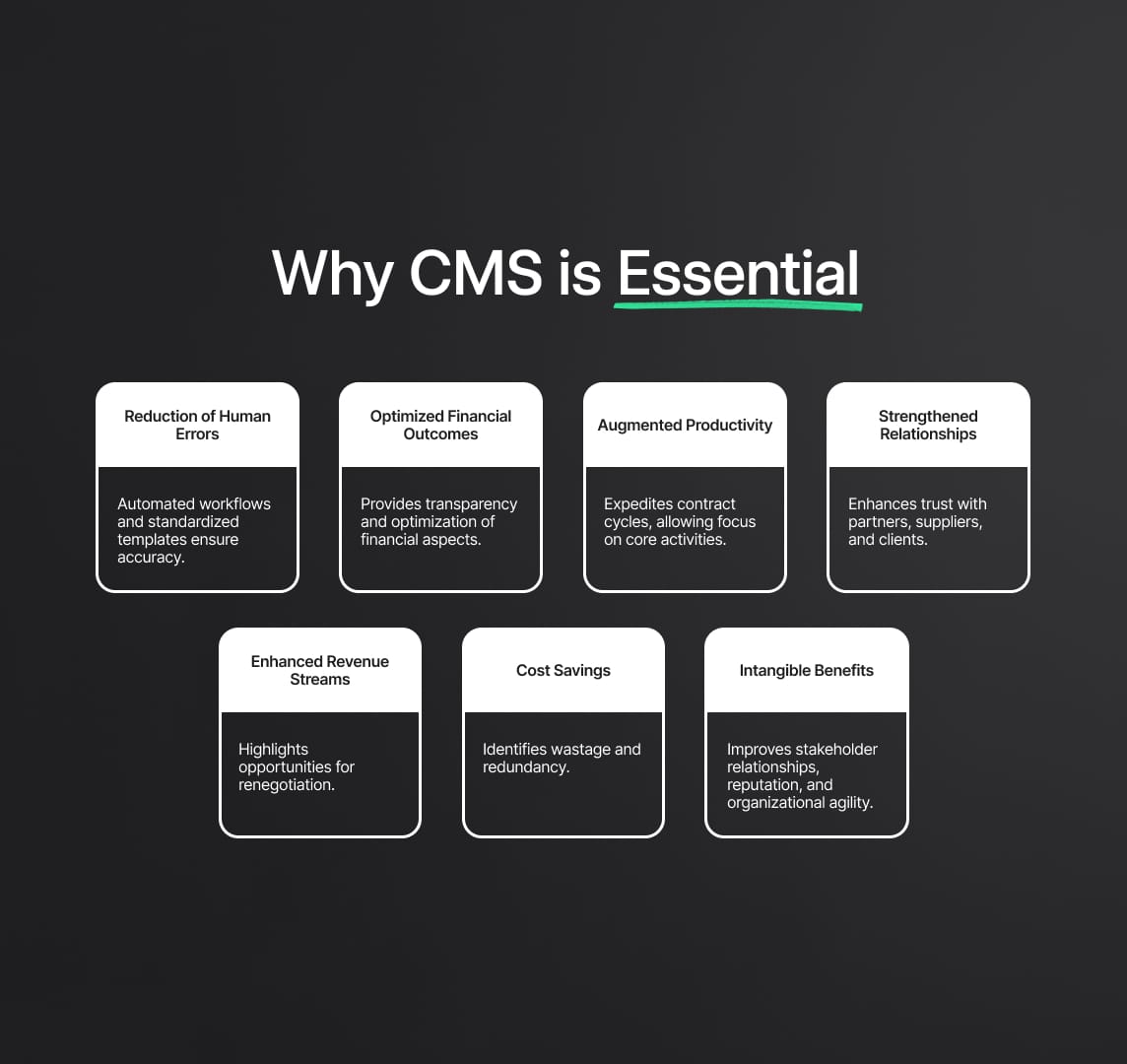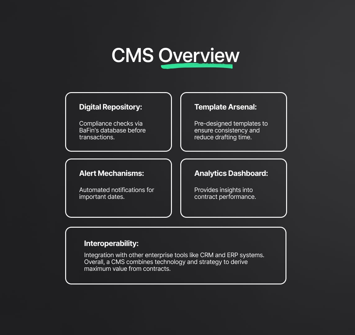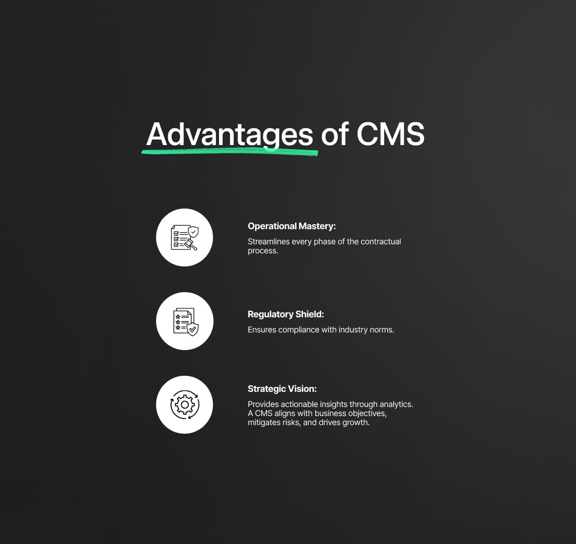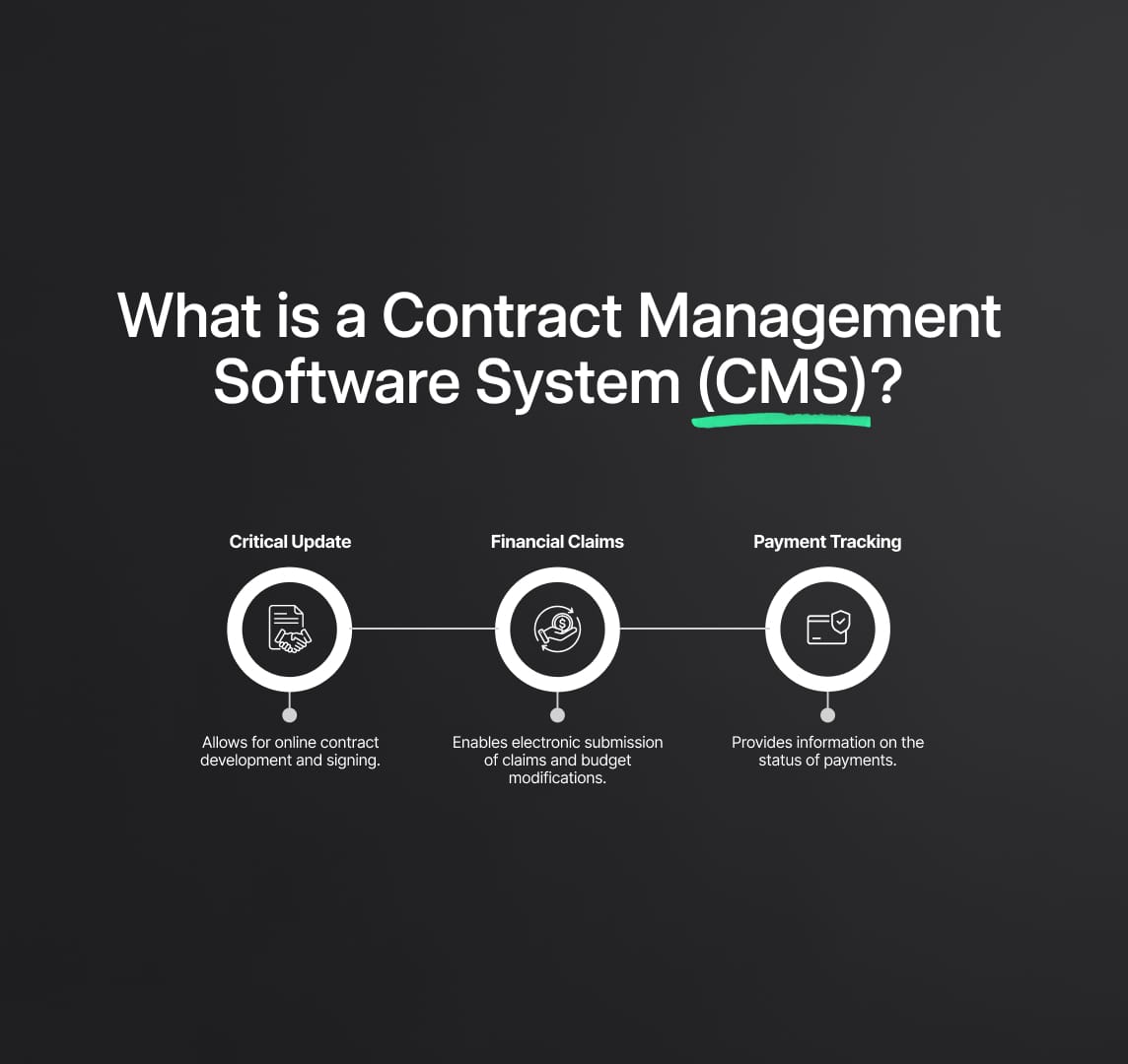 - CMS refers to the software solution that stores, tracks and automates contracts.